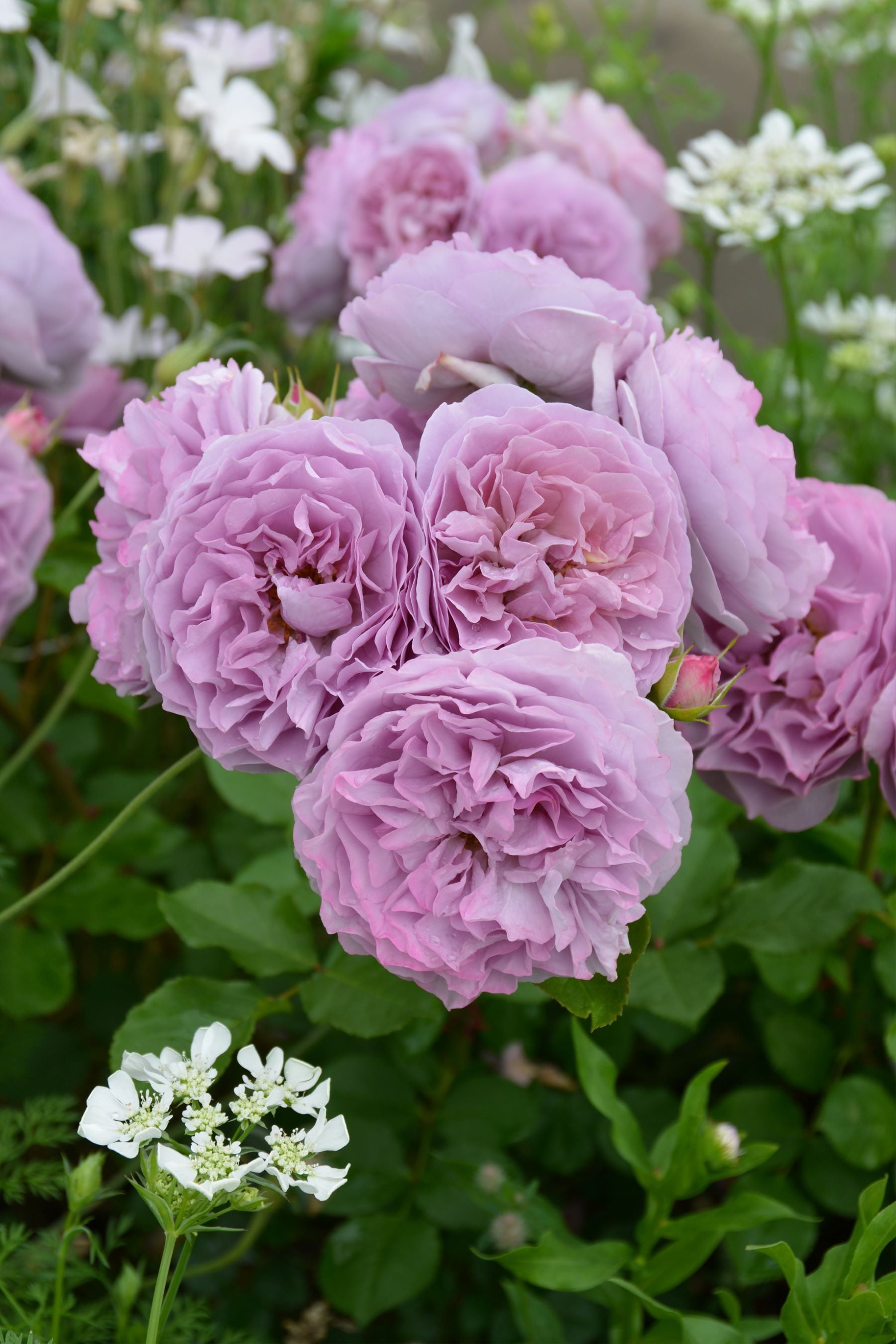 ブラウンがかった藤色の美しい花びらが優しく波打つロゼット咲き。コンパクトな樹形で房咲き。繰り返し良く咲き、耐病性も良い。