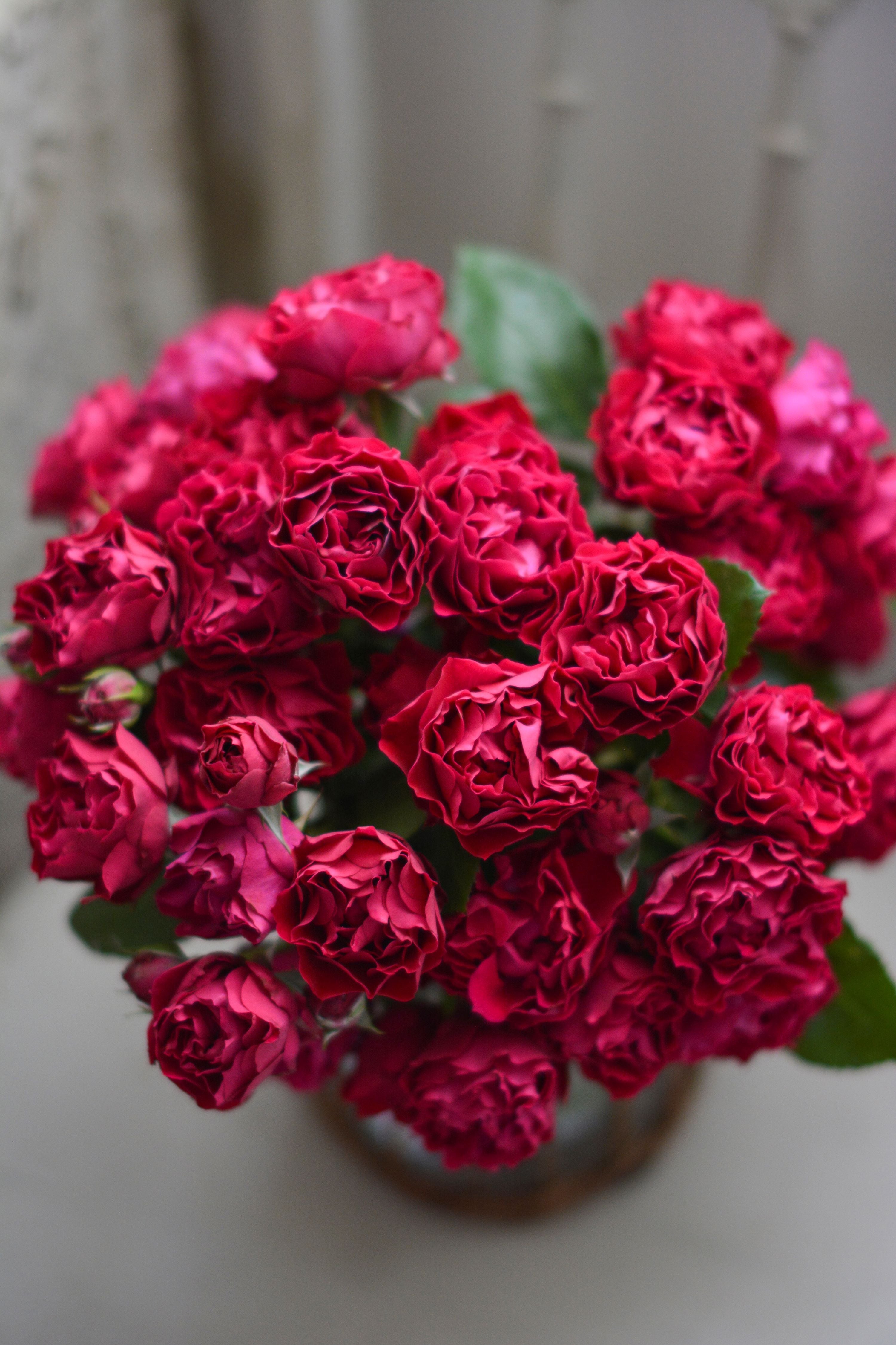 ローズピンクがかった赤い花色。 花びらはひらひらと波打ちながらもコロンとした少しのカップ咲きで、小さな「リンゴ」のイメージからフランス語で「ポム」と命名。 耐病性が強く花持ちも良いふんわりとそこにあるコンパクトな樹形。